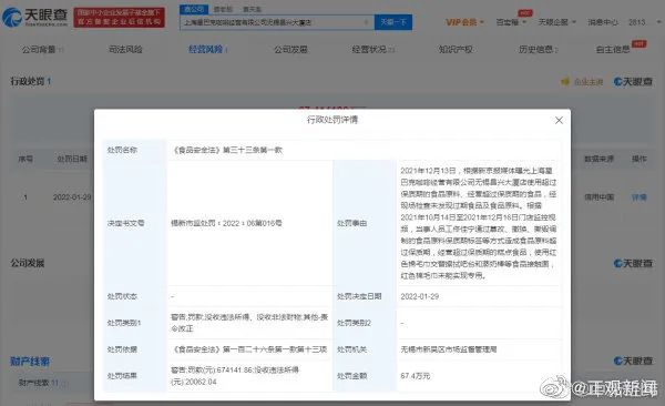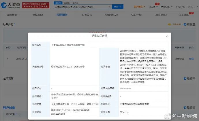 天眼查App显示,近日,上海星巴克咖啡经营有限公司无锡震泽路店、无锡昌兴大厦店因通过篡改、撤换、撕毁调制的食品原料保质期标签等方式,使用过期食品原料、经营过期食品;擦拭食品接触面的毛巾未能实现专用等行为,被无锡市新吴区市场监督管理局没收违法所得并分别罚款69万余元、67万余元。