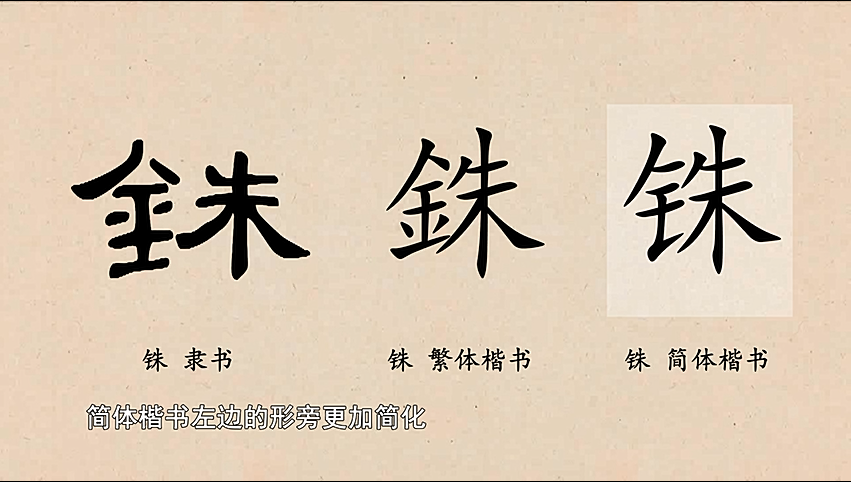 隶书和繁体楷书进一步符号化了,简体楷书左边的形旁更加简化。