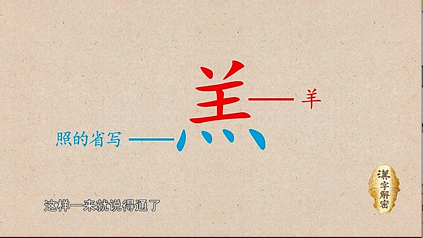 照是声符却省略了一部分,与省声有关,所谓省声就是省去形声字声符的一部分,使形声字的上下或左右均衡。也就是说羔字本来应该是写成上羊下照,但是这样写的话,结构太繁复,于是就把照省略了一部分,只保留了灬,这是许慎的看法。(主讲人 杨荣祥 北京大学中文系 教授)