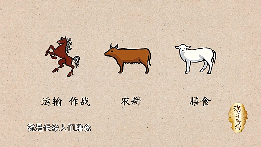 在中国古代社会,马主要是用来运输作战的,牛主要是用来耕地的,至于羊这种温顺的动物,它的主要功用就是供给人们膳食。《说文解字》中不止一次提到:“羊,主给膳也,所进也。”,说的都是羊作为膳食的功用。羔字正是羊的这一功用在汉字结构中的呈现,,除了羔字,我们也能在秀、羡这些字中看出羊提供膳食的功用,而牛和马主要不是用来吃的,所以自然不能用跟羔相同的思路来造表示小牛和小马这样的字。(主讲人 杨荣祥 北京大学中文系 教授)