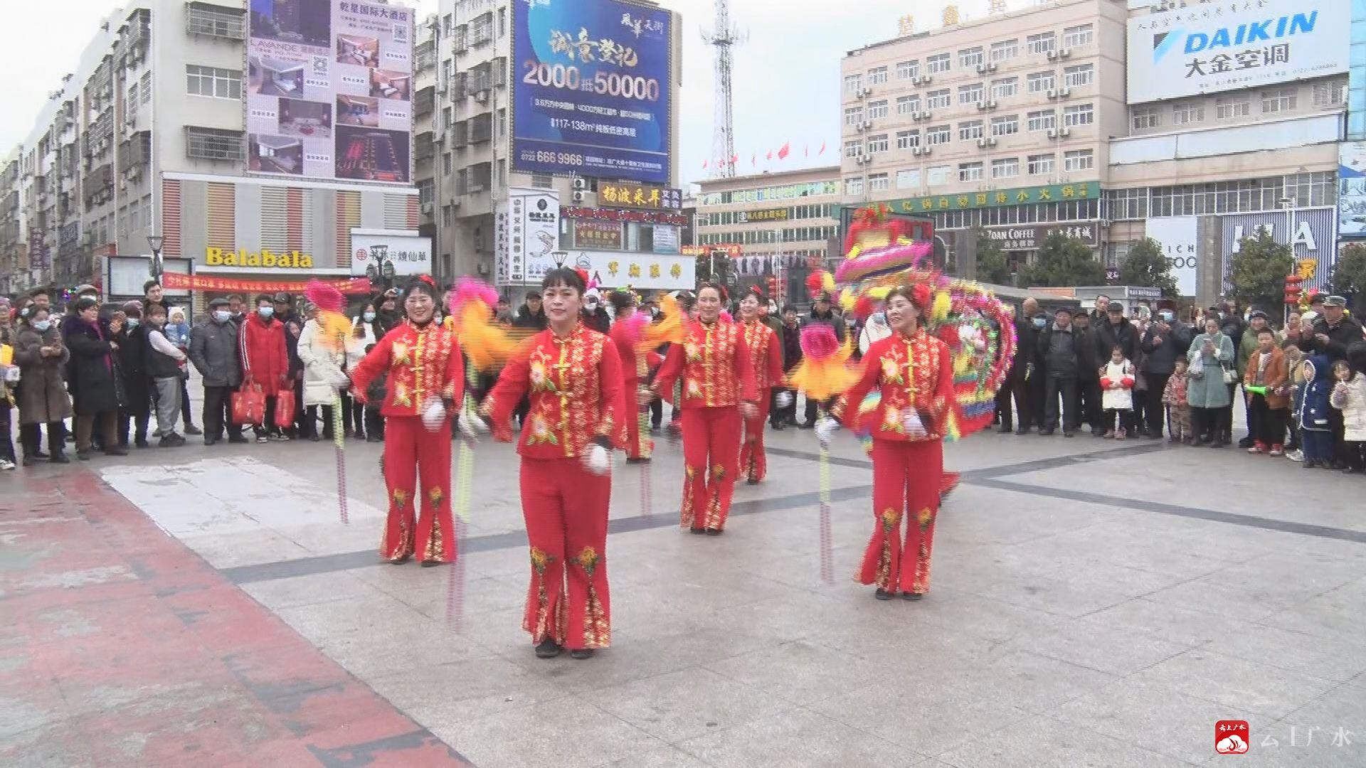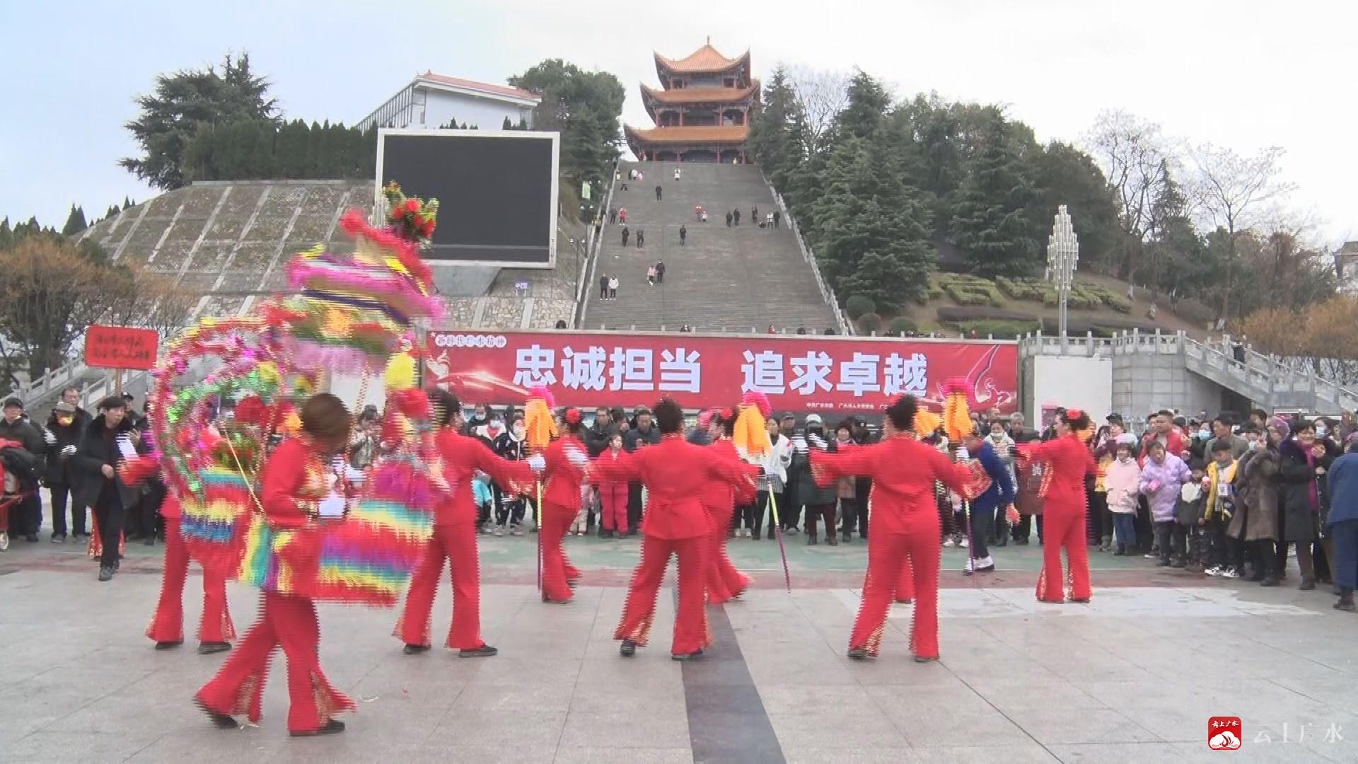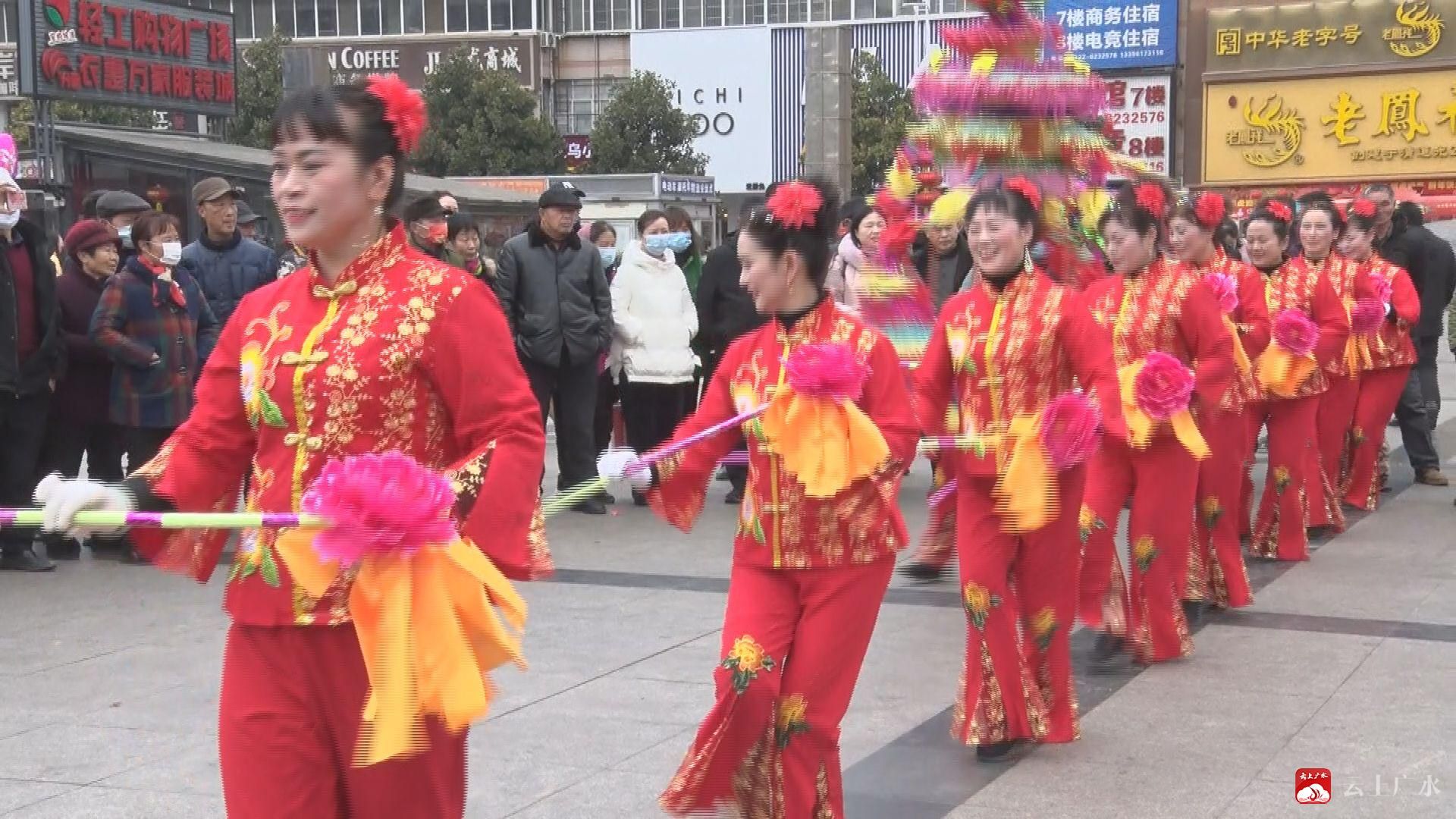【现场声】演员歌唱:“彩船来到广场上面,向广水人民拜新年,咿呀耶……”
