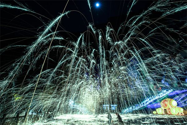 打铁花是一种大型民间传统焰火。正月十五当天,传统民俗“打铁花”在利川市腾龙洞5A景区上演,铁汁冲天而起,在空中迸散开来,刹时间铁花飞溅,鲜红滚烫的铁汁和绚丽无比的铁花,预示着新的一年老百姓的日子越过越兴旺、越过越红火。