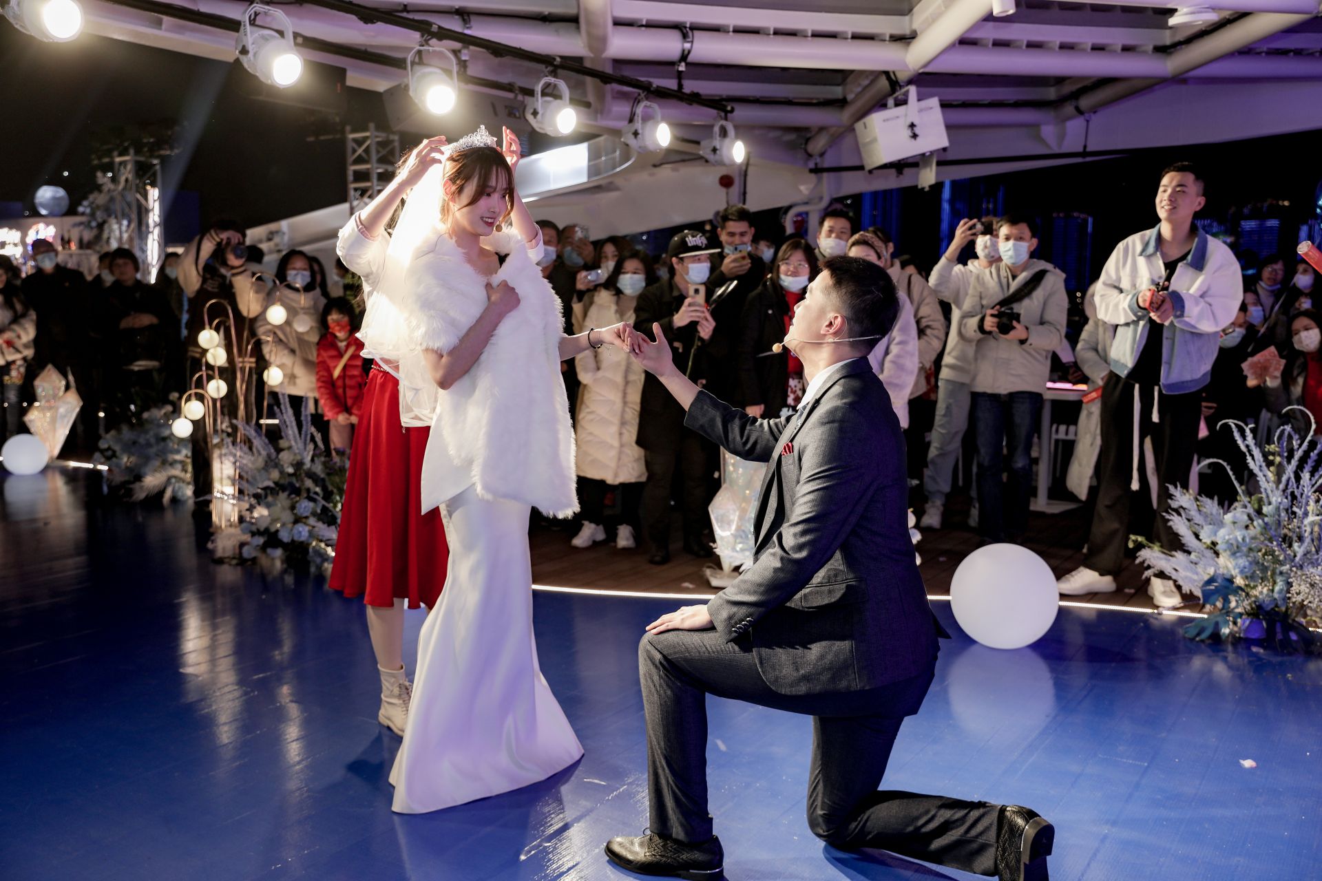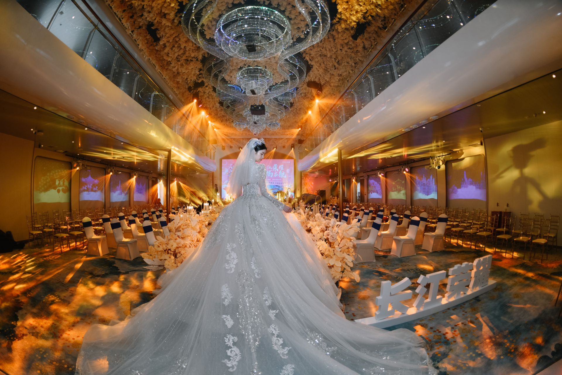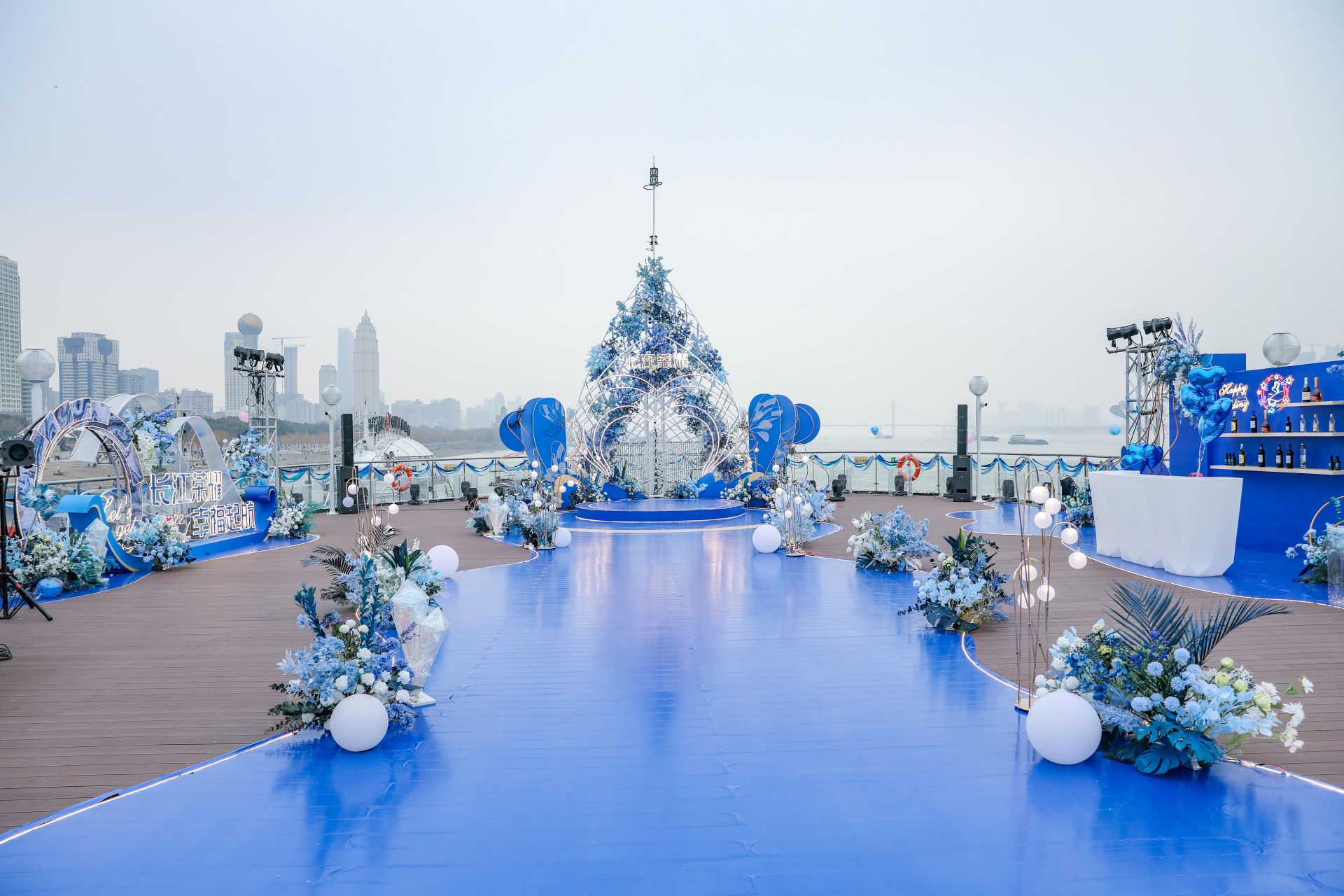 当晚,游轮打造的新型游轮演绎剧目:沉浸式婚礼秀剧游《我们结婚吧》首次亮相,联合武汉著名婚庆机构共同打造武汉首届婚纱时装秀。游轮婚礼堂布置有浪漫香槟金和深邃星空蓝两种不同调性的场景空间,超高清3D全息投影、定制化360度立体式声光电效果和超大露天观景甲板,直接将唯美浪漫的氛围感拉满。现场集结多款高定婚纱,专业模特演绎婚纱走秀,飘逸轻纱和经典重工纱齐上场,在灯光的掩映下,宛如走进一场童话世界。