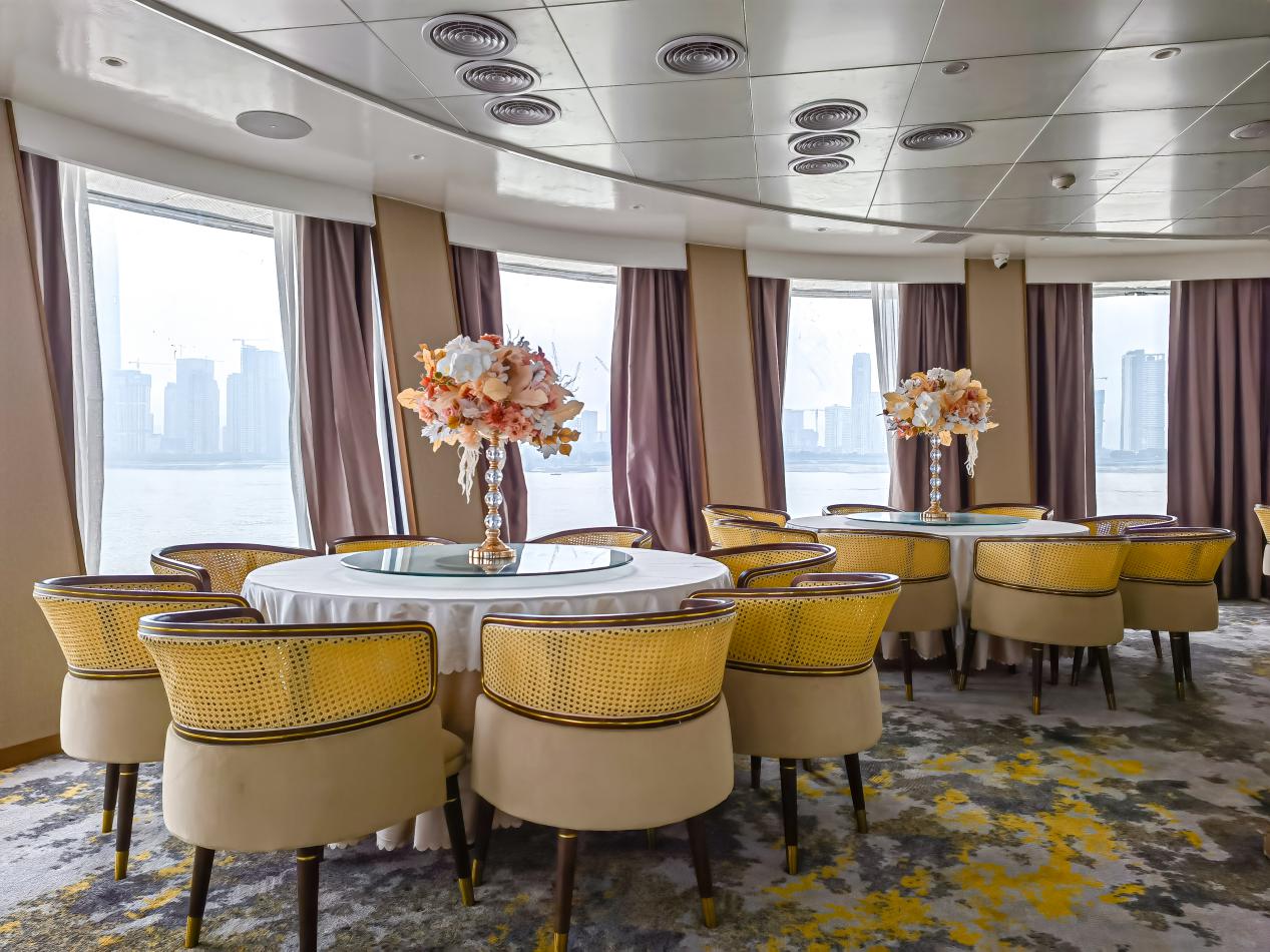 三层甲板拥有250㎡多功能厅、109㎡全景VIP厅、55㎡活动隔断连接包房,37㎡私密包房。可满足可满足接待商务、宴请、揽江观景等需求。