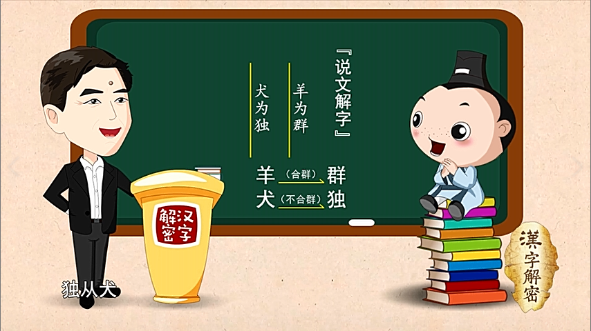 《说文解字》中说:“羊为群,犬为独。”,羊是具有兼容性的动物,犬是具有排他性的动物。所以群从羊,独从犬。(主讲人 杨荣祥 北京大学中文系 教授)