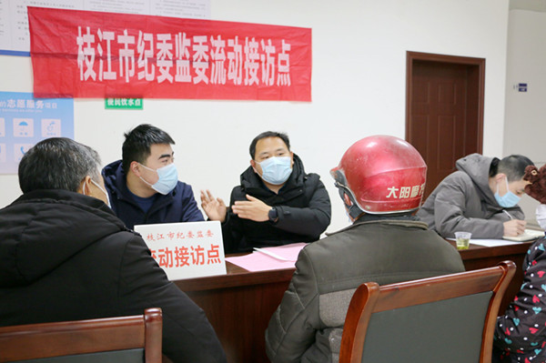 枝江市纪委监委开展 “新春走基层”巡回下沉遍访活动,8个流动接访小组以开门接访、带案约访、重点走访等形式,切实将矛盾化解在基层一线。图为该市纪检监察干部在董市镇为群众现场答疑。(任薇 摄)