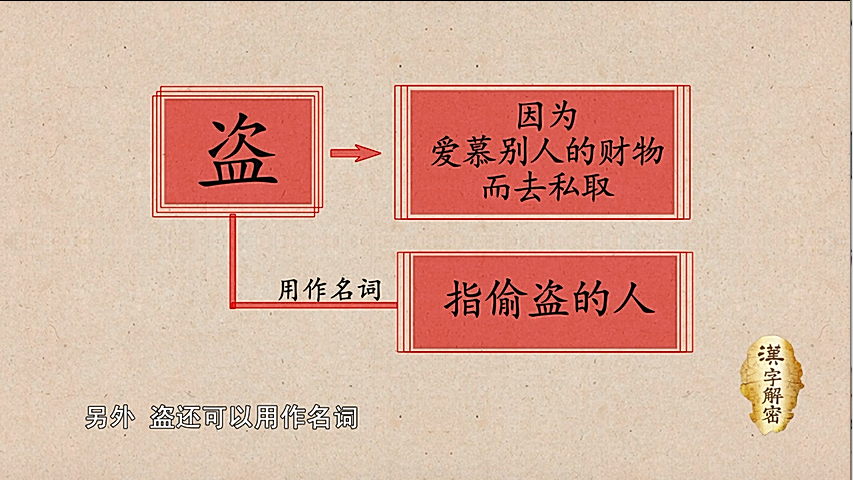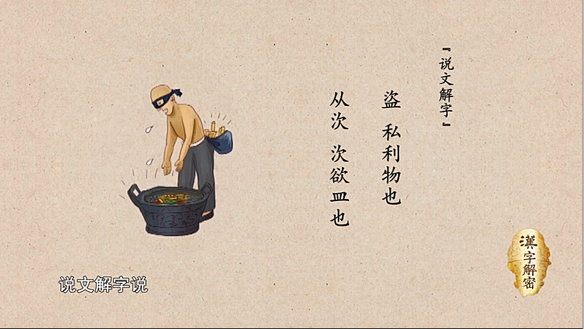 《说文解字》中说:“盗,私利物也。从㳄,㳄欲皿也。”,意思是说,盗就是偷偷地将好东西据为己有。他强调因为爱慕别人的财物,而去私取的意思。另外盗还可以用作名词,指偷盗的人。(主讲人 孙玉文 北京大学文学院 教授) w w 责任编辑 胡劲