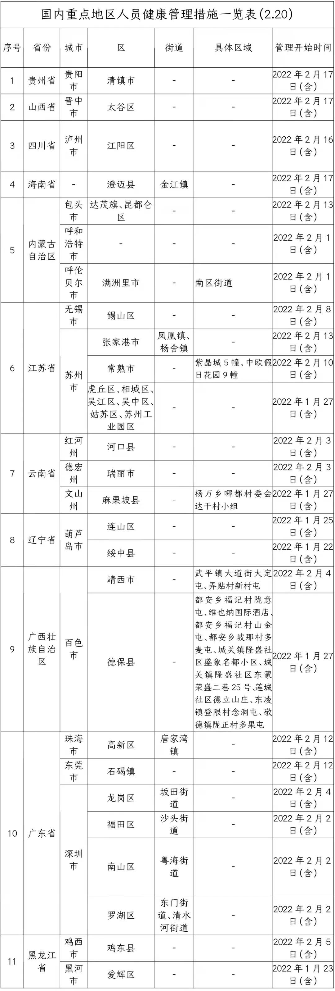2月20日,四川省泸州市江阳区、山西省晋中市太谷区、贵州省贵阳市清镇市、黑龙江省鸡西市鸡东县、内蒙古包头市达茂旗均报告新增新冠病例和阳性感染者,江苏、广西、内蒙古和云南部分地区连续多日无新增病例。根据湖北省防指调整重点地区管控措施,为严防疫情输入,科学精准防控疫情,有效控制和降低疫情传播风险,对2月16日(含)以来有四川省泸州市江阳区、2月17日(含)以来有山西省晋中市太谷区和贵州省贵阳市清镇市、2月5日(含)以来有黑龙江省鸡西市鸡东县、2月13日(含)以来有内蒙古包头市达茂旗旅居史的来鄂返鄂人员实施健康管理措施.现对广大群众提出如下疫情防控提醒: