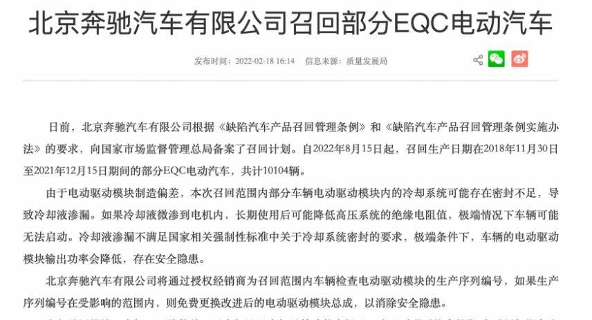 近日,因存安全隐患,北京奔驰EQC正式宣布召回。