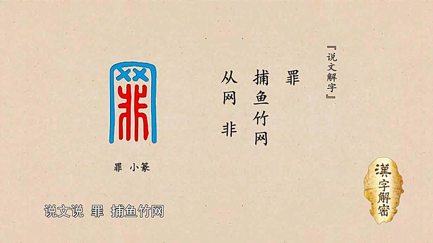罪字的小篆字形,上面是一个网,下面是一个非字,就是是非的非,《说文解字》中说:“罪,捕鱼竹网。从网,非。”,罪字原本指的是一种捕鱼的竹网。(主讲人 孙玉文 北京大学中文系 教授)