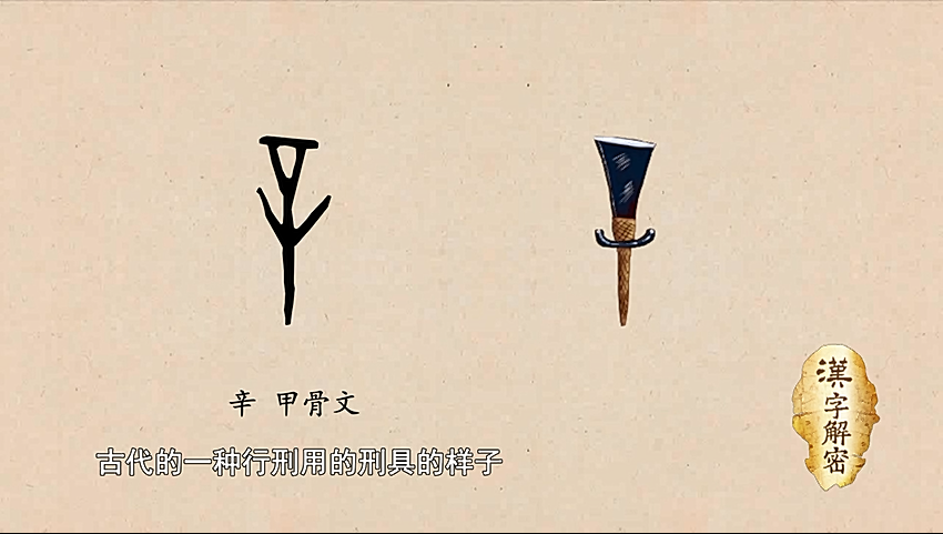 古代的辛是一种行刑用的刑具的样子,从辛的字很多都跟犯罪和诉讼有关。比如辜字就是罪的意思,上面是一个古是声旁,下面一个辛。再就是复辟的辟,它也有罪行、犯罪的意思,右边也是辛字。