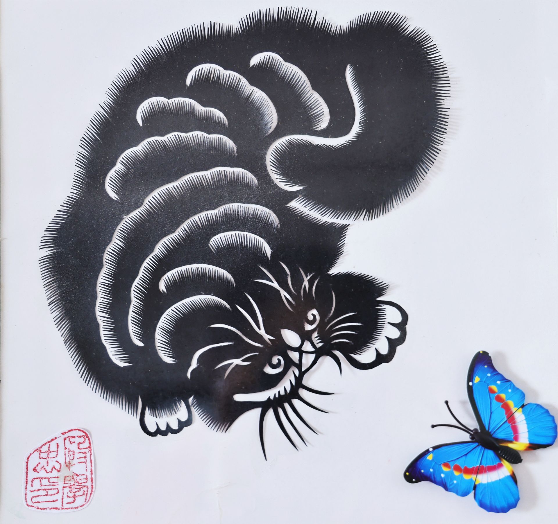 一把普通家用剪刀,一张不大的废弃广告纸,在传统手工艺、非物质文化遗产剪纸艺术家殷学忠灵活双手转动下,一会儿的功夫,一只栩栩如生的蝴蝶呼之欲出。