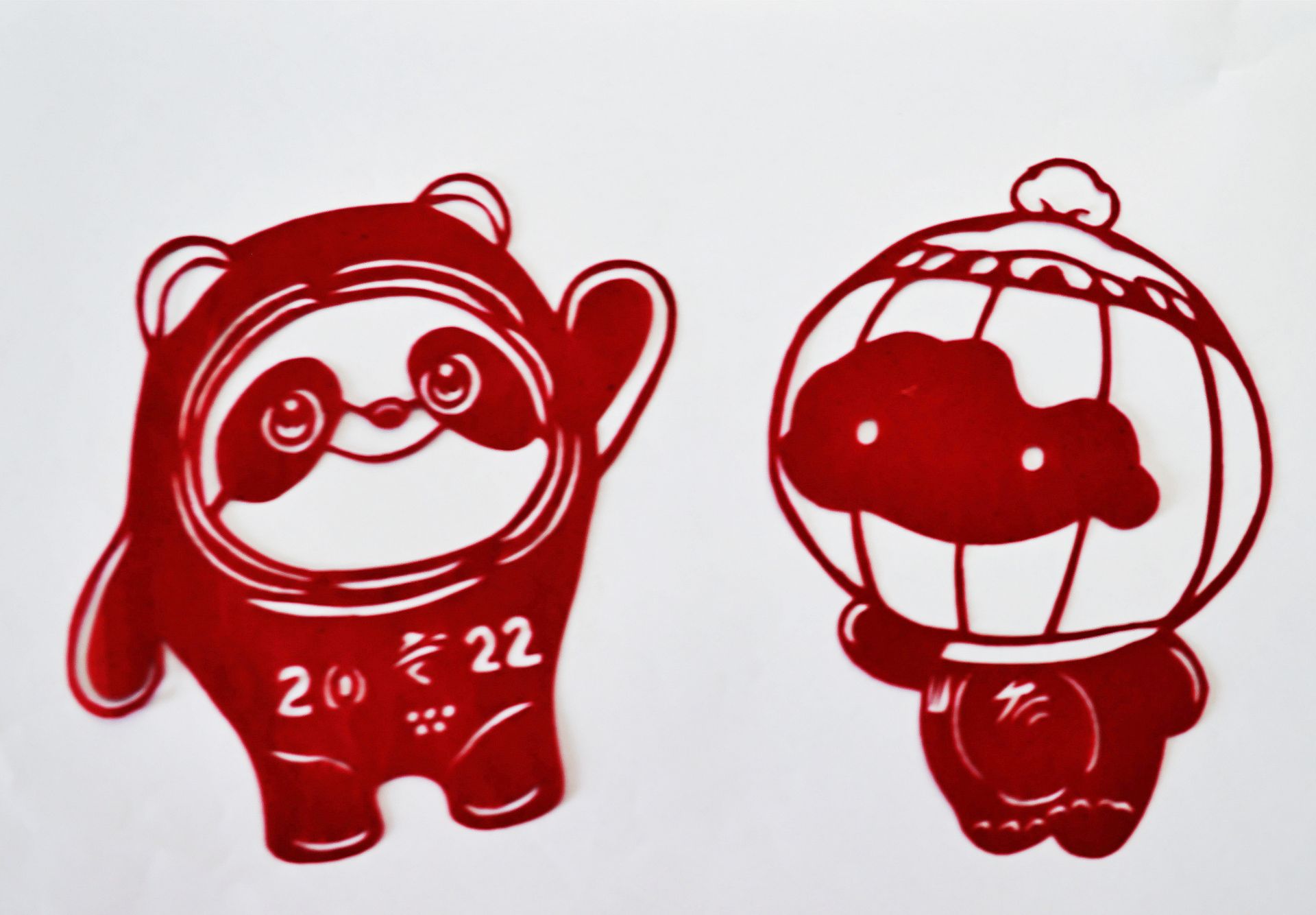 冰墩墩和雪容融,是当下多少人向往梦寐以求都难以到手的抢手货,殷老以剪纸方式体现。
