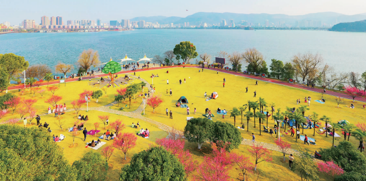 图为磁湖北岸桂花湾广场,市民在湖畔踏青、游玩。记者 石勇 摄