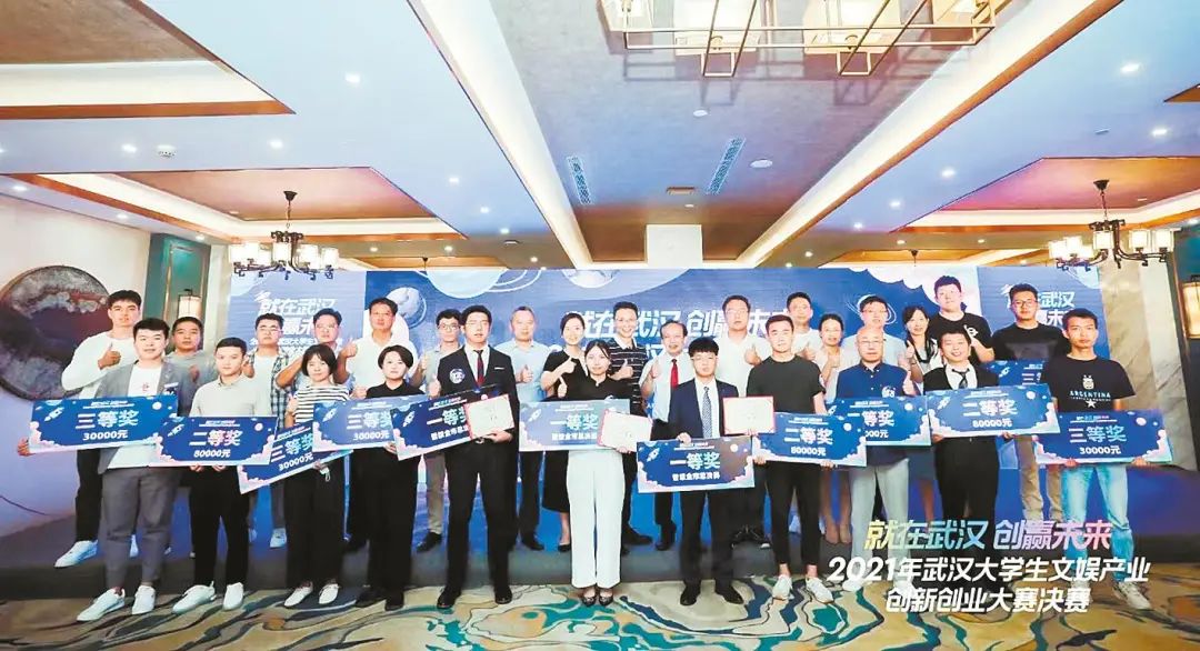 2021年武汉大学生文娱产业创新创业大赛参赛选手与评委嘉宾集体合影。