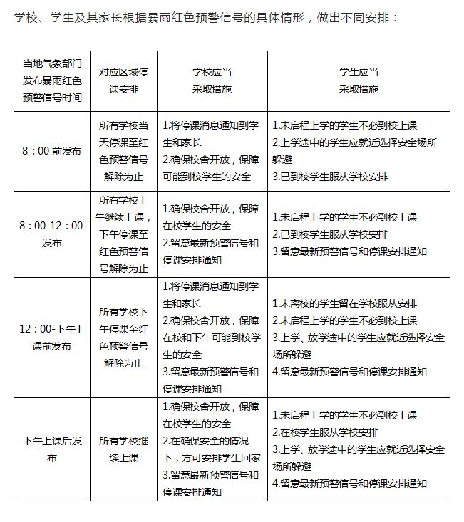 3月6日,河南省教育厅、河南省气象局印发《关于在暴雨红色预警条件下实行停课措施的通知》,明确规定当地气象部门发布暴雨红色预警信号后,所在地各级教育行政部门要果断采取停课措施,对应区域内所有开展教育教学活动的幼儿园、中小学校、中等职业学校全面停课。