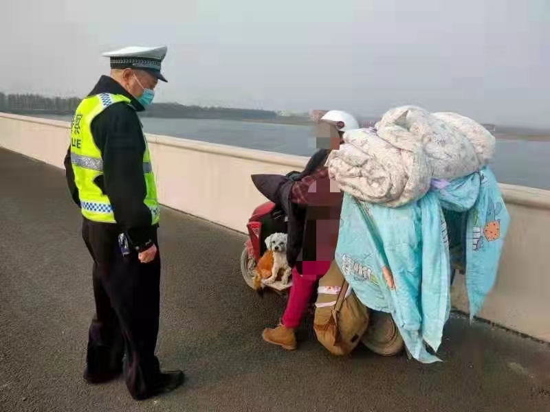 3月14日下午3时40分许,青山区交通大队指挥室值班民警刘波突然接到一个女性电话,“请问您是交警吗?”在得到确认回答后,报警人说“我电动车没电了,能不能帮帮我!”“莫着急,请靠边停好车辆,注意后方来车,告诉我们你在哪个方位!”,刘波耐心安抚老人并询问她所在的位置,但老人也弄不清楚,只能说自己从阳逻过来的,在一座大桥上,从桥上可以看见北湖武钢,推测老人可能在四环线青山长江大桥上,刘波一方面通知三中队巡逻民警上桥寻找,一边通知四环线监控中心在可能的位置进行巡查,最终三中队民警刘惠明和辅警姚俊发现了将电动车停在护栏边上的老人,车上载着行李和两条宠物狗。