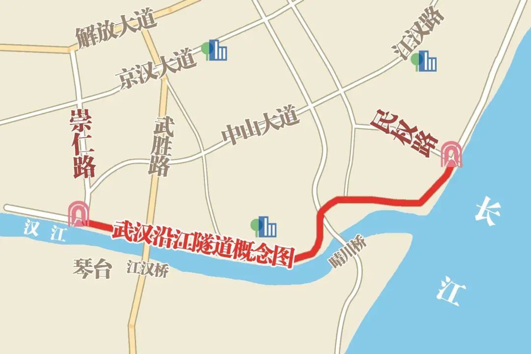 汉口沿江隧道基础设施项目起于崇仁路,止于民权路,全长6公里。其中,隧道沿汉江、长江沿岸布设,全长约4.1公里,包括地下隧道、地面道路、景观绿化等。其中,地下隧道为单洞双层隧道,上层隧道从崇仁路到民权路,下层隧道从民权路到崇仁路,均为3车道,沿线设5对匝道出入口。汉口沿江隧道基础设施完工后,可较好地服务汉正街核心区对外交通,从汉正街经此隧道可15分钟到达市内主要交通枢纽和功能组团,30分钟可上主城外围高速公路。目前,该项目前期的规划、涉水审批等工作正在紧锣密鼓开展,力争今年底开工。