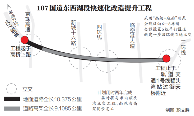此次改造,107国道东西湖段还将新建全长9公里的高架桥快速路。
