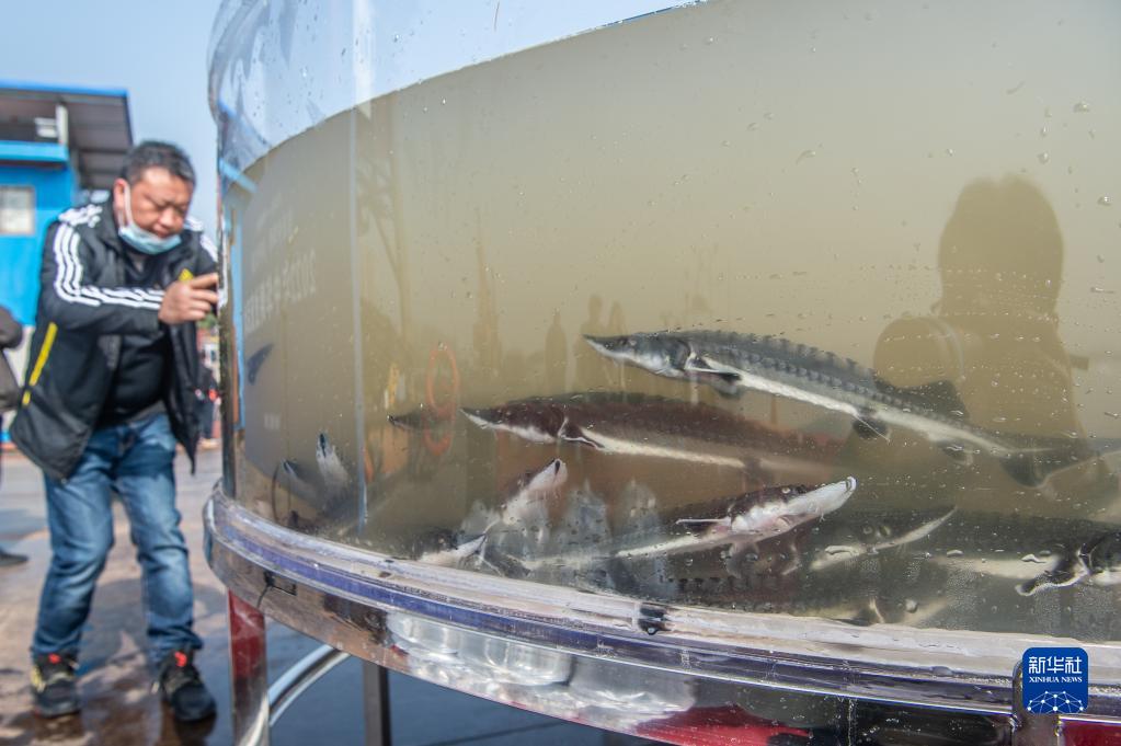 3月28日,在放流活动现场,工作人员在拍摄准备放流的中华鲟鱼苗。