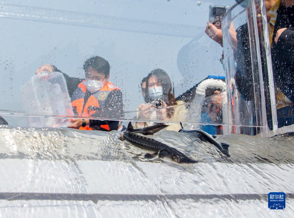 当日是中华鲟保护日,在长江武汉江段,约5万尾全人工繁殖中华鲟鱼苗成功放流长江。