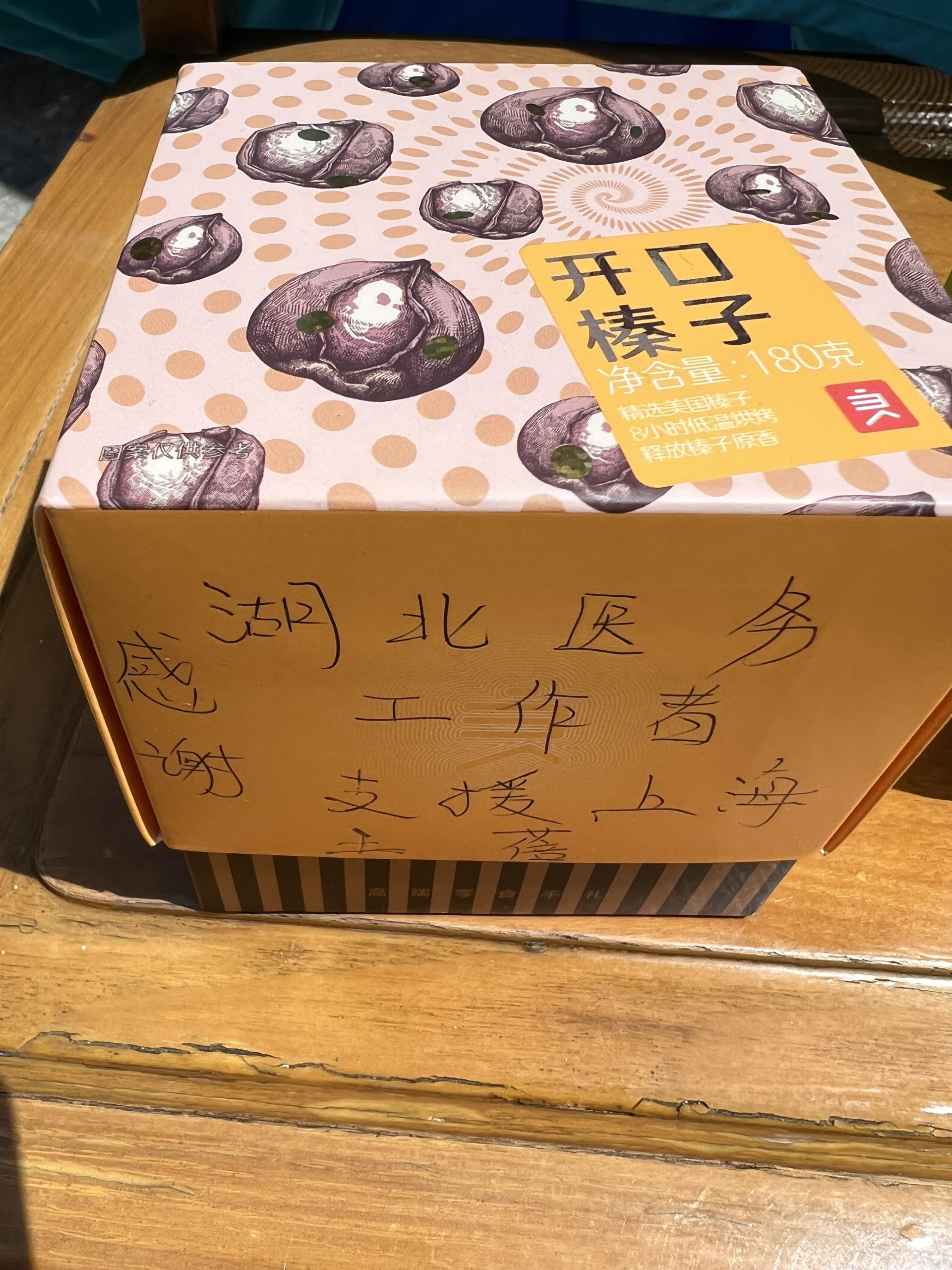 李明惠和队员所到的社区,一位6岁的男童在核酸采集完成后,对着她鞠躬致谢,还赠送了手写的卡片。不少热心居民送来了水果,零食和糖果,贴心的在包装盒上写上感谢。秦晨光医生跟随医疗队清晨5点出发,10点到达第二站西郊佳景苑小区,定居在这里的几位湖北老乡见到医疗队格外亲切,完成核酸检测后还特意送来可口的饭菜。冯同富医生上午为70多个家庭的老人上门采集核酸,老人们非常热情好客 不停的说着感谢,核酸采集结束后离开小区, 社区干部还在路边夹道欢送。温暖的事还有很多,援沪医疗队员被上海市民浓浓的热情和关爱包围。
