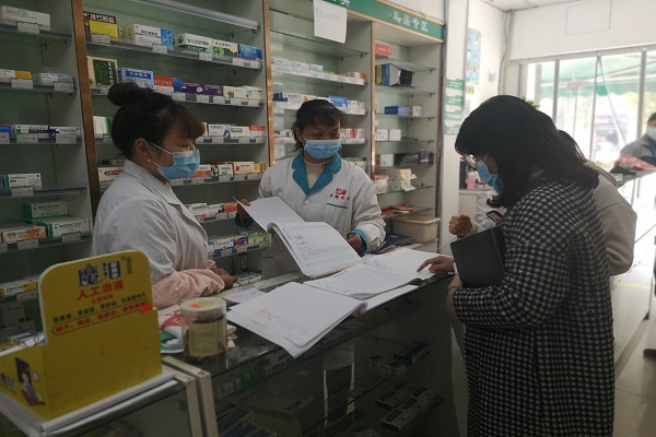 下陆区纪委监委成立2个督查组,对辖区内的公墓陵园、药店诊所、宾馆酒店、商超等场所进行疫情防控监督检查,重点查看场所测温、人员登记、重点药品销售等防疫规定的执行情况,对发现的问题现场提出整改意见。图为督查组在药店对重点药品售卖台账进行检查。