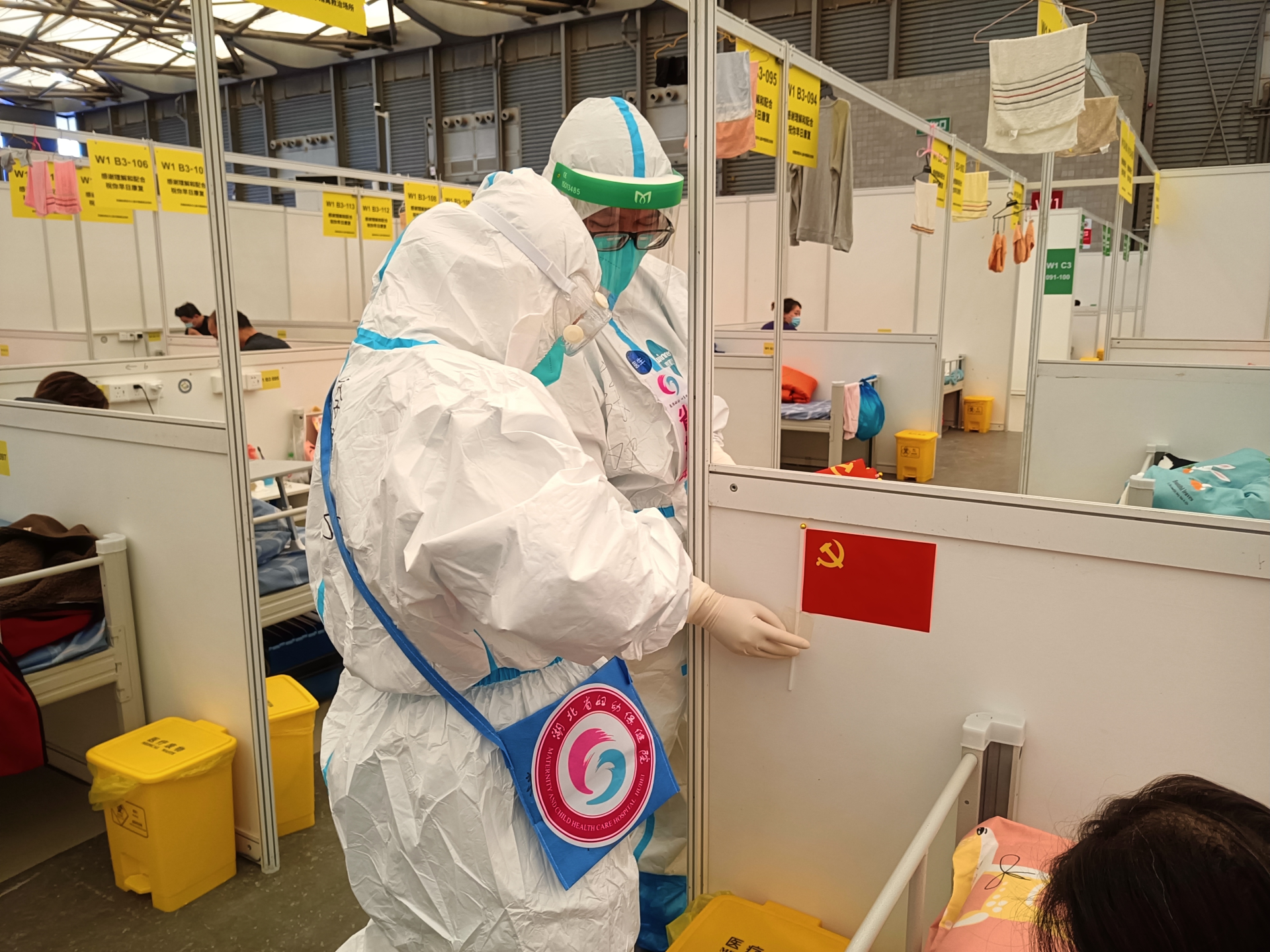 4月6日,湖北省妇幼保健院援沪医疗队进舱后,医护人员在查房的同时做了患者情况摸底,在每一位党员患者的床位旁边贴上了党旗,亮明身份,并组建了党员患者微信群。