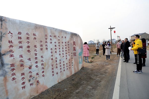 图为以“莲”喻“廉”,荷花堰村在清廉村居建设中设置石刻《爱莲说》