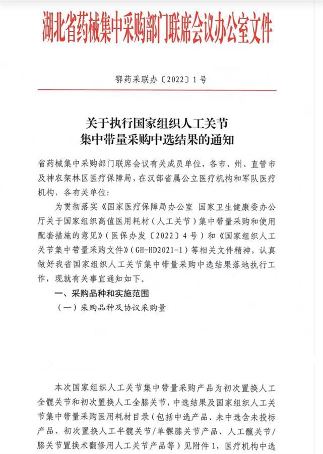 从湖北省医保局获悉,随着我国老龄化社会的到来,用于置换的人工髋关节、膝关节使用量逐年增加,但是高昂的关节置换价格一直以来困扰着广大患者。4月25日起,湖北省执行国家组织人工关节集中带量采购中选结果。执行采购周期为2022年4月25日至2024年4月24日。