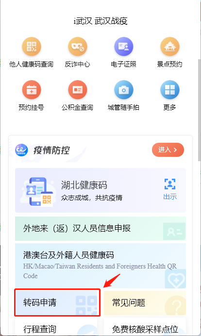 手机打开微信客户端,搜索“武汉战疫”进入小程序,之后点击“转码申请”。