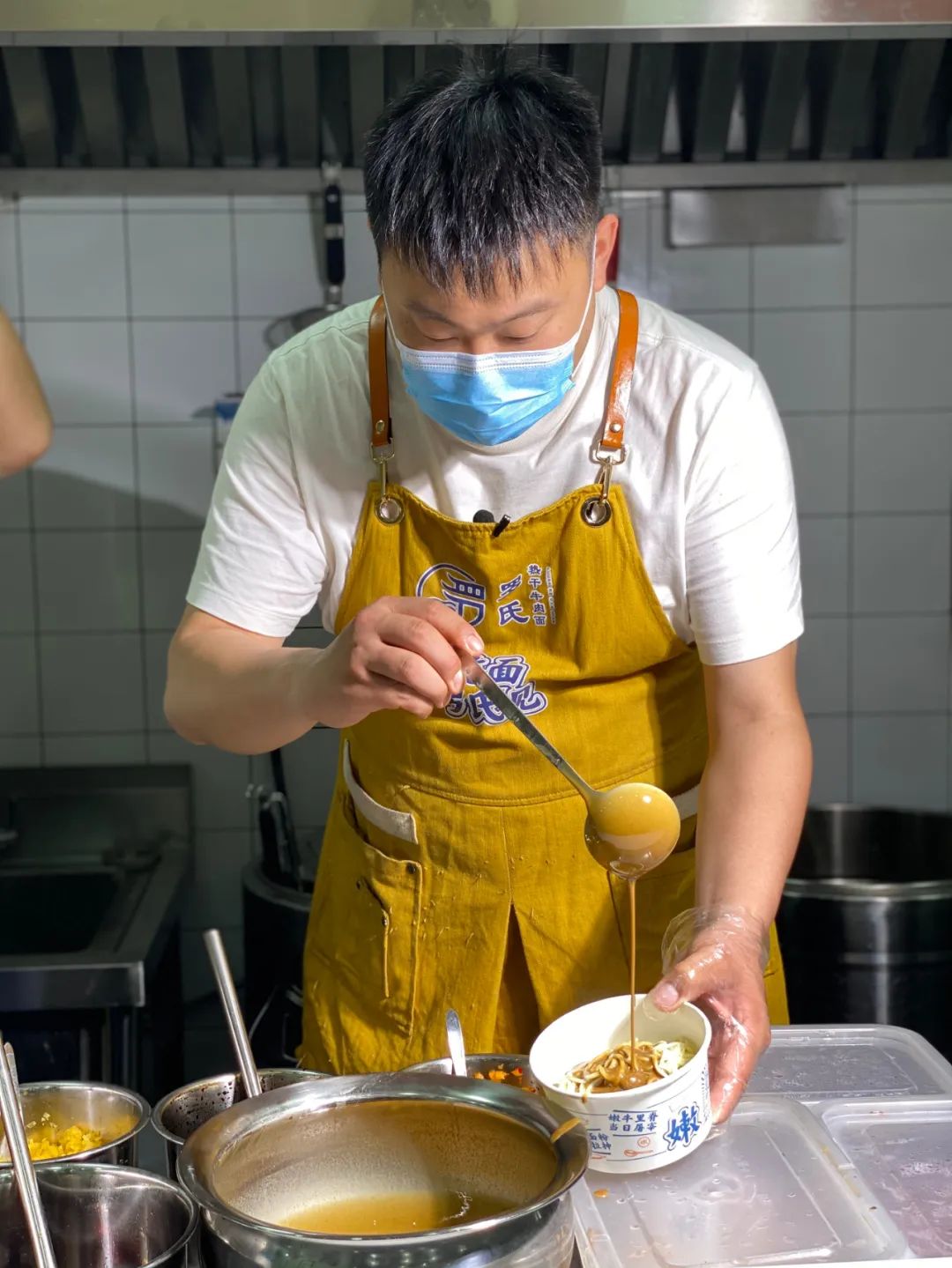如今的武汉伢罗思偲,已经在全国开出了69家面馆。很难想象,曾经的他,初中毕业就走上社会,当过保安,打过小工,遭过无数白眼。也许是命运的安排,罗思偲的热干面之旅开始得很偶然。罗思偲从小到大,学习成绩很不好,家里条件也比较差。中考后,当了保安的他,在一次指挥车子倒车时,被车主责骂“你怎么这么蠢,活该你穷一辈子”。当时,他被这句话深深刺痛了,“我哪怕笨,但是我也不能再当保安了。有一天,他偶然看到一个热干面店,进去打听,工资比当保安还多,就开始学徒下面条了。生炉子、掸面、熬汤,大冬天的,他的手在冷水里捞面,再到沸水里烫面,一双手变得紫红。母亲每每看到他的一双手,都忍不住流眼泪。而罗思偲不想其他,只闷头苦干。几个月后,师傅就让他开始学习调制热干面。或许是天赋使然,很快罗思偲就收获了食客的第一句“好吃!”。罗思偲记得,当时是纯手工,每个人自己要学掸面。热干面煮的时间久一点,像橡皮筋,一拉它有弹性,有的人就喜欢吃这个口感。△淋上芝麻酱