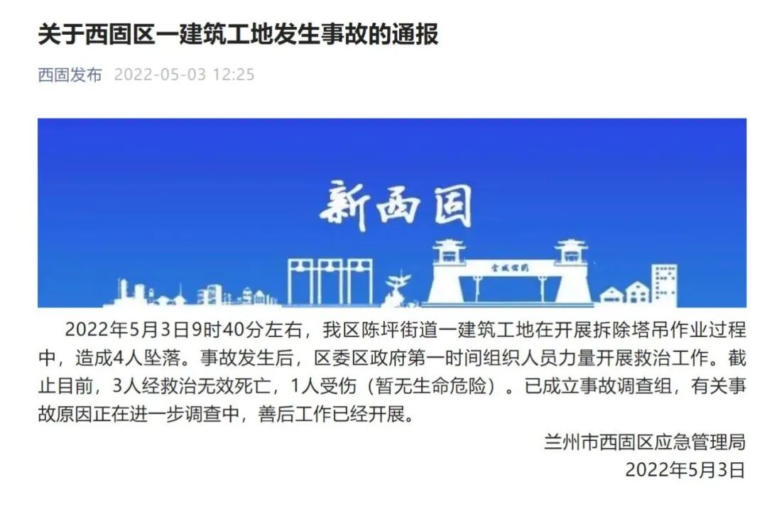 据西固发布消息:2022年5月3日9时40分左右,甘肃省兰州市西固区陈坪街道一建筑工地在开展拆除塔吊作业过程中,造成4人坠落。事故发生后,区委区政府第一时间组织人员力量开展救治工作。截止目前,3人经救治无效死亡,1人受伤(暂无生命危险)。