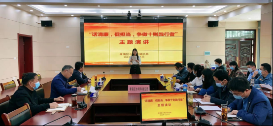 孝南区深入推进清廉机关建设,广泛开展清廉主题座谈调研、主题演讲、视频创作、干部讲堂等系列活动,发动广大年轻干部积极参加,在新时代新征程中展现年轻干部应有的朝气与担当。图为该区水利和湖泊局举办“话清廉、促担当,争做‘十则’践行者”主题演讲比赛。