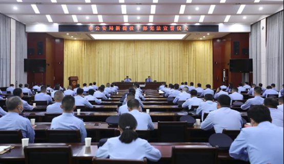孝感市纪委监委各派驻(出)机构紧盯驻在部门年轻干部新入职、新调动、新提拔等关键节点,通过普规普纪、纪法宣讲、廉政谈话、观看警示教育片等方式,促使年轻干部纪律作风养成。图为市公安局举行宪法宣誓仪式后,市纪委监委派驻市公安局纪检监察组负责人与新提拔年轻干部集中廉政谈话。