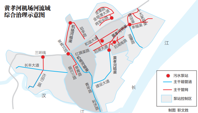 地图上可见,黄孝河、机场河呈倒“人”字形,流经江岸、江汉、硚口、东西湖等城区,流域汇水面积126平方公里,地下管道流经人口稠密区域,是全市目前规模最大、范围最广的城市排水管网,覆盖250余万市民。