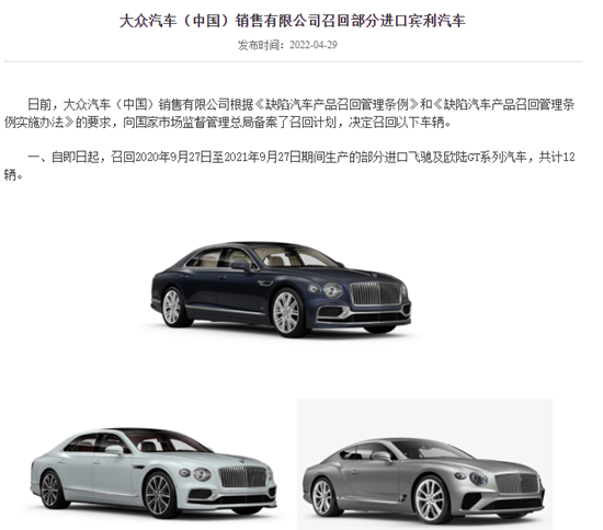 最后,大众汽车(中国)决定自即日起,召回2020年9月27日至2021年9月27日期间生产的部分进口飞驰及欧陆GT系列汽车,共计12辆。
