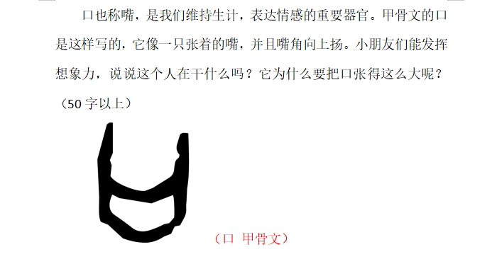 大家知道吗,自己的“自”字在最开始其实是鼻子的意思,后来在表示自身这个意思的时候,人们常常用手指着自己的鼻子,一来二去,就习惯用原来表示鼻子的自字来表示自己本人。那么,小朋友们能够发挥想象力,以甲骨文的自字为基础,自己造字并说明理由吗?