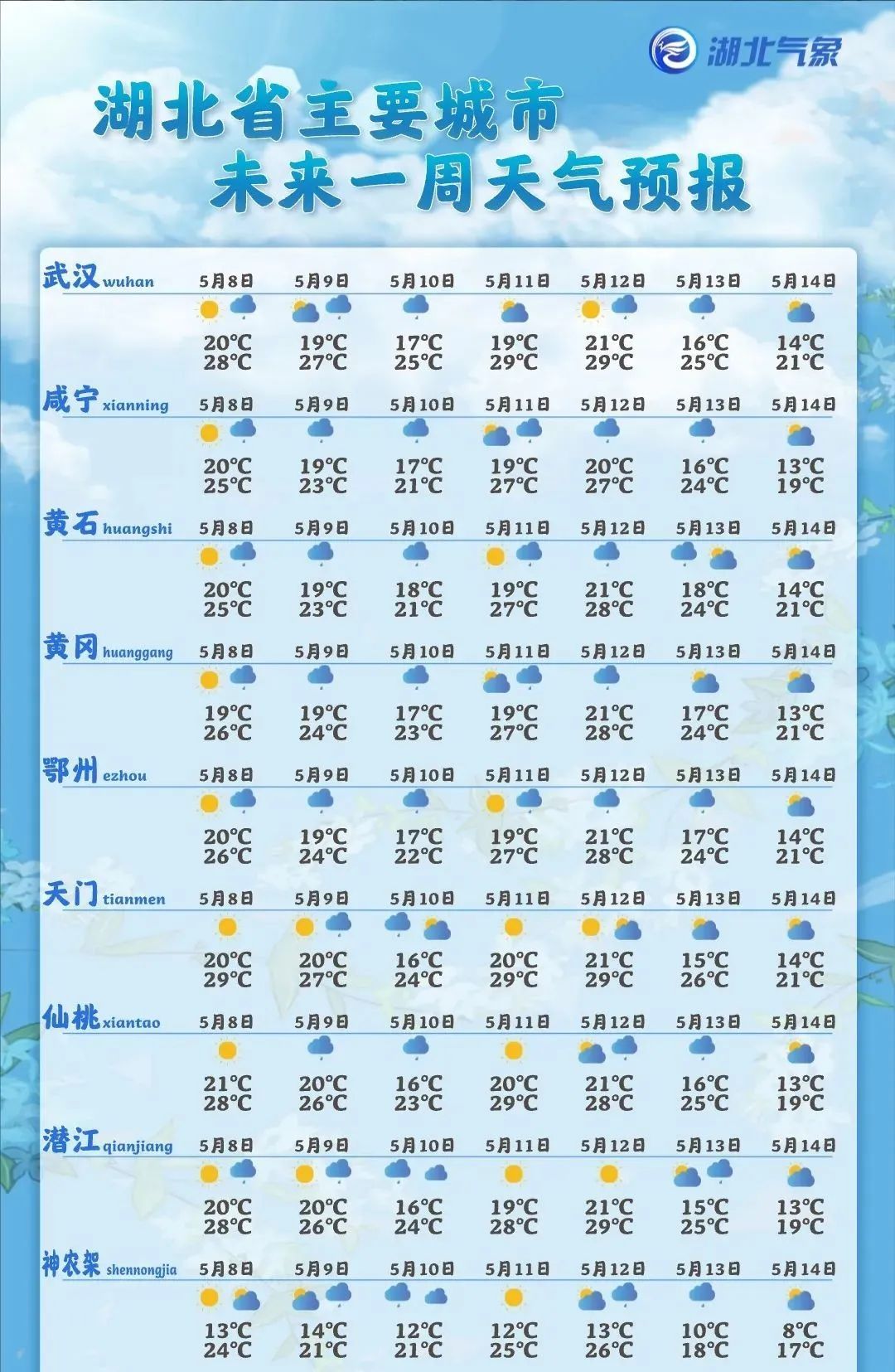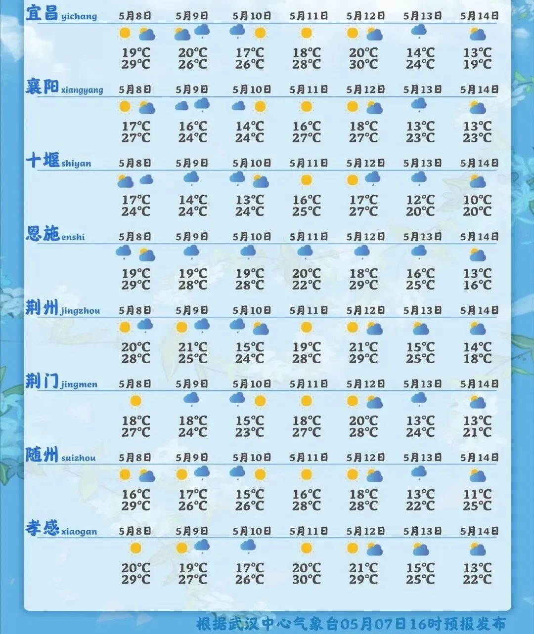 最低气温:鄂西北14~17℃;其他地区17~20℃