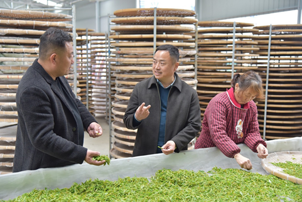 赤壁市纪委监委把巩固脱贫攻坚成果和助推乡村振兴工作紧密结合,组织各级纪检监察干部开展大走访,重点摸排产业项目落地、产销管理等方面存在的痛难点问题。图为该市纪委监委工作人员向茶企负责人了解茶叶发展情况。