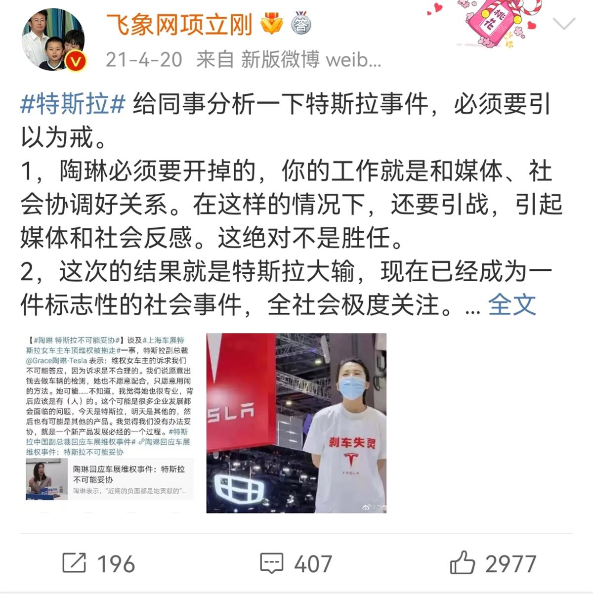 公开资料显示,项立刚是飞象网创始人、《通信世界》创始人,其微博拥有粉丝一百多万。项立刚在微博上曾多次就特斯拉汽车发表评论认为,特斯拉副总裁陶琳在应对上述上海车展舆论危机时,处理并不适当,并称其应和媒体、社会协调好关系,而不应引战,引起媒体和社会反感。5月12日,极目新闻记者试图通过项立刚个人微博账号与其取得联系,截至发稿,对方尚未回复。