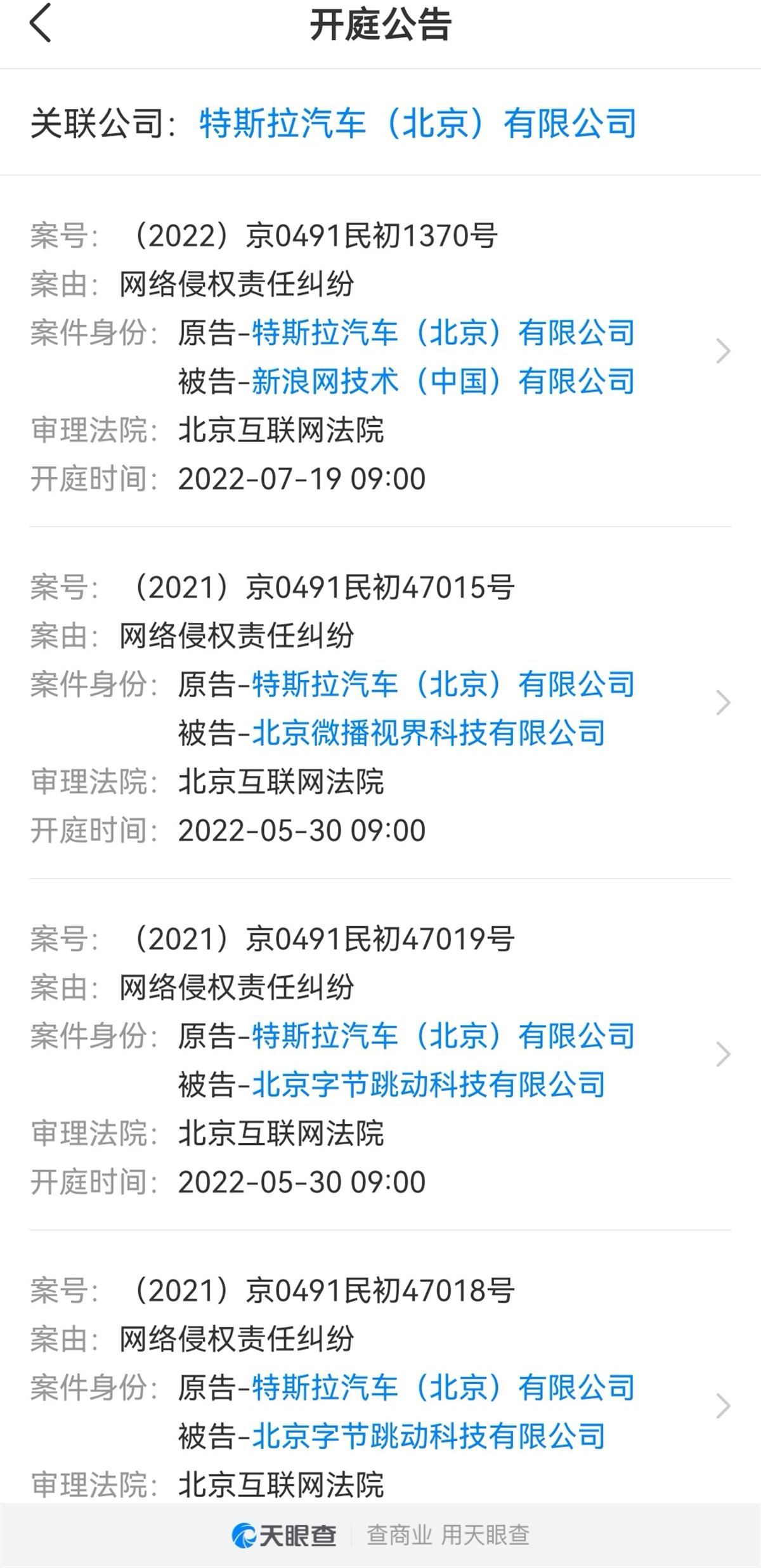 天眼查显示,近日特斯拉与知名大V项立刚等网络侵权责任纠纷一案新增开庭公告,原告为特斯拉汽车(北京)有限公司,案件将于5月24日在北京互联网法院开庭。记者注意到,特斯拉除起诉知名大V外,还起诉多家网络平台,案件分别于5月和7月中旬开庭。