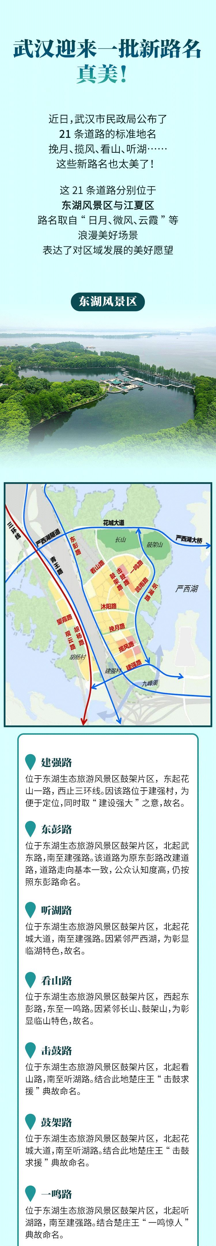 挽月、揽风、看山、听湖……这些美好的词语都出现在了武汉的路名中12日获悉市民政局公布了21条道路的标准地名快来看看↓↓↓