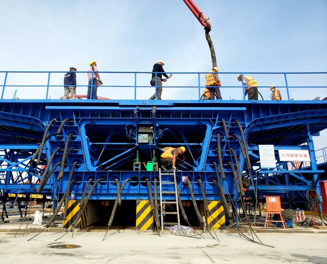 为顺利完成首片箱梁浇筑,项目部采用了“施工工序区域固定、流水线作业”的预制新模式,通过自行式移动台座将钢筋胎具绑扎区、模板安装浇筑区、温湿度智能喷淋养护、智能张拉压浆区和存梁区有机串联,不仅有效降低工人的劳动强度和安全风险,还提高了箱梁品质和预制工效。