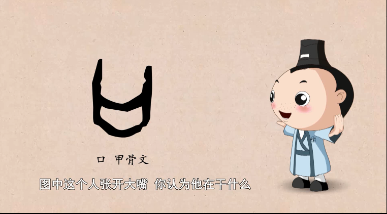 大家知道吗,口也称嘴,是我们维持生计、表达情感的重要器官,甲骨文的口是这样写的,它像一只张着的嘴,并且嘴角向上扬。小朋友们能发挥想象力,说说这个人在干什么吗?他/她为什么要把口张得这么大呢?