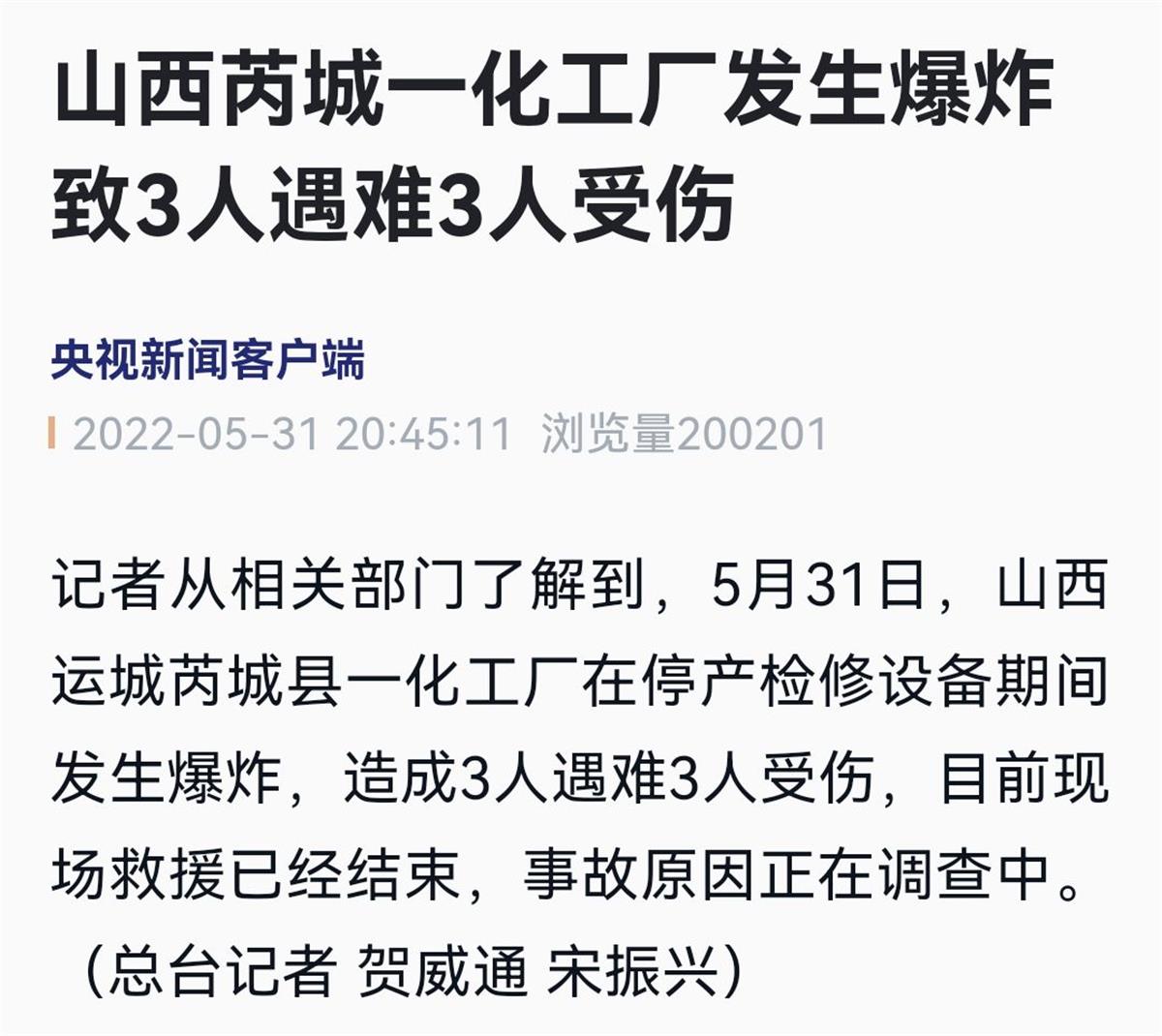 据央视新闻报道,5月31日,山西芮城县一化工厂在停产检修设备期间发生爆炸,造成3人遇难3人受伤。附近一目击者告诉记者,事发时爆炸声音特别大,她误以为是地震,仔细一看窗户玻璃上都有裂纹。