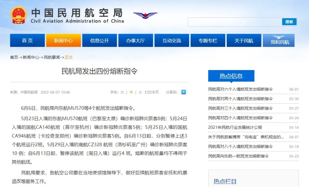 6月6日,民航局向东航MU570等4个航班发出熔断指令。