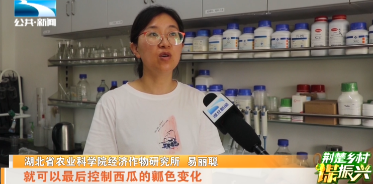 湖北省农业科学院经济作物研究所 易丽聪:“通过不同基因的组合,就可以最后控制西瓜的瓤色变化,西瓜的皮色。”