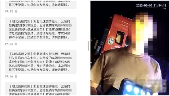 多条疲劳驾驶短信提醒发出,当事人却浑然不知。最近(6月10日),在沪渝高速公路利川段,一辆重型货车在行驶途中,忽视“云哨”风险预警,连续驾车超5小时,湖北高速交警迅速处置,及时消除安全风险。