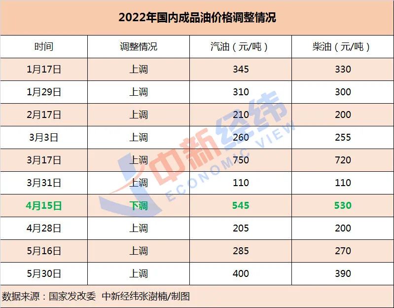 中新经纬梳理,2022年以来,国内成品油价格已进行了十轮调整,汽油价格累计上调2330元/吨,柴油价格累计上调2245元/吨,呈现“九涨一跌”格局。